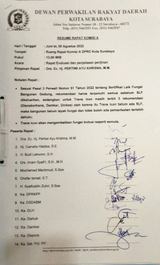 Menanggapi hal itu, Vice President Corporate Communication Apartemen dan Mall Trans Icon Surabaya, Satria Hamid mengatakan, akan memastikan konsisten sesuai stamen yang disampaikan dalam rapat
