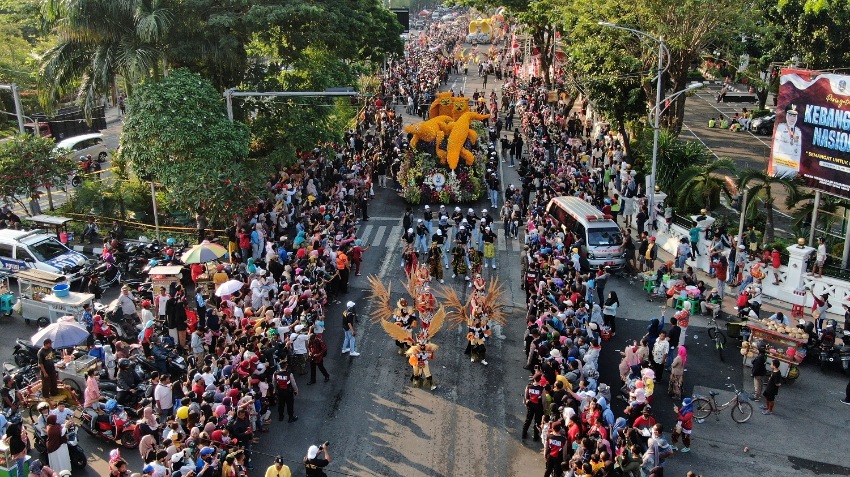 Surabaya – Ribuan masyarakat tumplek blek di sepanjang Jalan Pahlawan hingga menuju Jalan Gubernur Suryo Surabaya, Sabtu (27/5/2023). Mereka nampak antusias menyaksikan jalannya Surabaya Vaganza atau Parade Bunga dan Budaya.