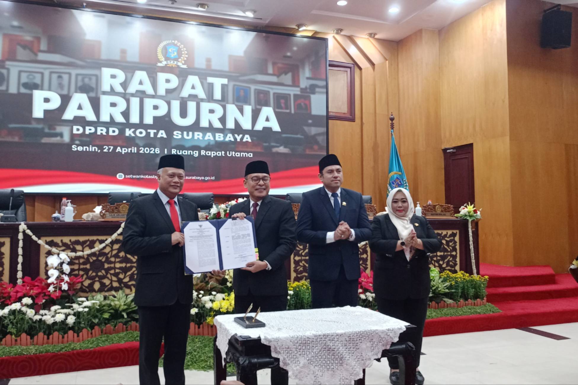 Surabaya – Sejumlah agenda dalam rapat paripurna digelar oleh DPRD Kota Surabaya bersama pemerintah kota (Pemkot), Senin (27/4/2026) siang.