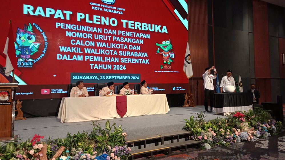 Surabaya – Rapat pleno terbuka pengundian dan penetapan nomor urut calon walikota dan wakil walikota Surabaya digelar oleh KPU Kota Surabaya Senin (23/9/2024) pagi.