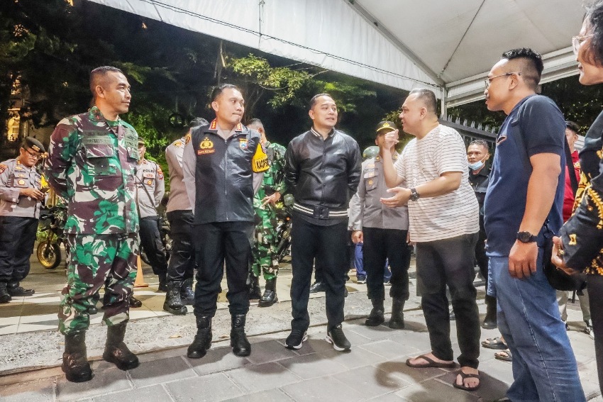 Sambil mengendarai sepeda motor, Wali Kota Eri bersama Komandan Korem 084/Bhaskara Jaya Brigjen TNI Yusman Madayun, dan Kapolrestabes Surabaya, Kombes Pol Pasma Royce meninjau beberapa titik pos pengamanan.