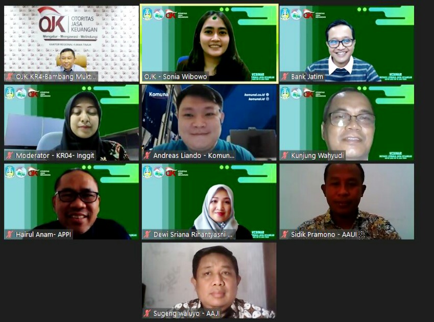 Surabaya – Memperingati Hari Guru Nasional Tahun 2020, Otoritas Jasa Keuangan Regional 4 Jawa Timur bekerja sama dengan Forum Komunikasi Lembaga Jasa Keuangan (FKLJKD) Provinsi Jawa Timur dan Dinas Pendidikan Provinsi Jawa Timur serta Komisi Nasional Pendidikan Provinsi Jawa Timur menyelenggarakan Webinar Inovasi Lembaga Jasa Keuangan kepada Guru SMP dan SMA/sederajat se-Jawa Timur yang dibuka oleh Gubernur Jawa Timur yang diwakili oleh Dr. Ir. Jumadi, M.MT, Asisten II Perekonomian dan Pembangunan Sekretariat Daerah Prov. Jatim. Kamis (03/12/2020).