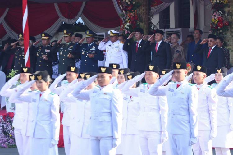 Surabaya – Pemerintah Kota (Pemkot) Surabaya menggelar upacara peringatan Hari Lahir Pancasila, di Halaman Balai Kota – Taman Surya, Senin (2/6/2025).