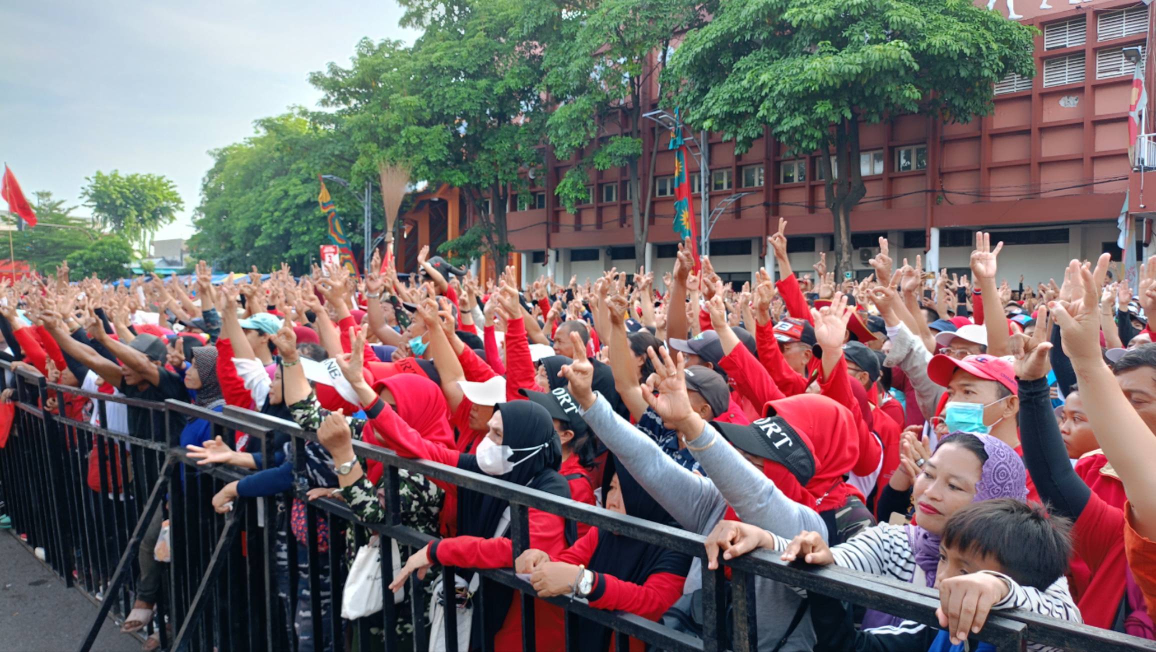 Acara tersebut digelar oleh DPC PDI Perjuangan Kota Surabaya di depan Stadion Gelora 10 November Tambaksari dihadiri jajaran pengurus dan simpatisan partai juga ribuan masyarakat. Minggu (17/11/2024) pagi.