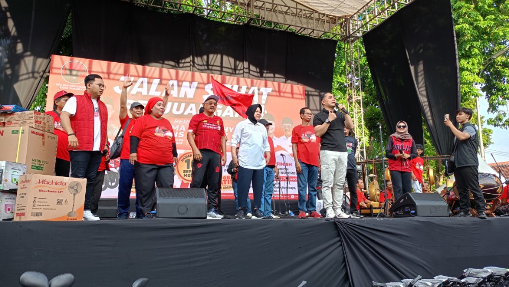 “Lek Suroboyo milih”e nomer?,” tanya Eri Cahyadi dihadapan peserta jalan sehat.