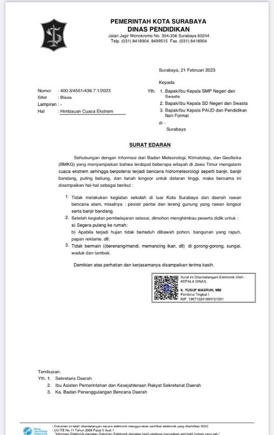 Surabaya – Pemerintah Kota (Pemkot) Surabaya melalui Dinas Pendidikan (Dispendik) Kota Surabaya menerbitkan Surat Edaran (SE) bernomor 400.3/4551/436.7.1/2023 mengenai Himbauan Cuaca Ekstrem. Surat tersebut ditujukan kepada Kepala SD, SMP negeri dan swasta, serta Kepala PAUD dan Pendidikan Non Formal di Kota Surabaya.