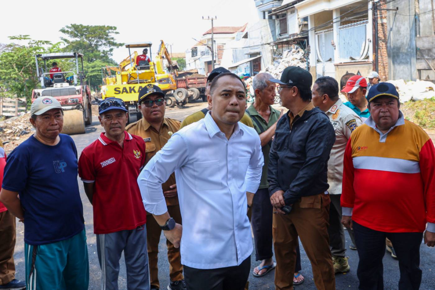 Surabaya – Wali Kota Surabaya Eri Cahyadi melakukan inspeksi mendadak (sidak) proyek pengaspalan jalan di kawasan Kali Tebu, Jalan Dukuh Bulak Banteng, Kelurahan Sidotopo Wetan, Kecamatan Kenjeran, Selasa (21/4/2026). Dalam sidak kali ini, ia ingin kawasan tersebut tertata rapi dan bersih dari sampah.