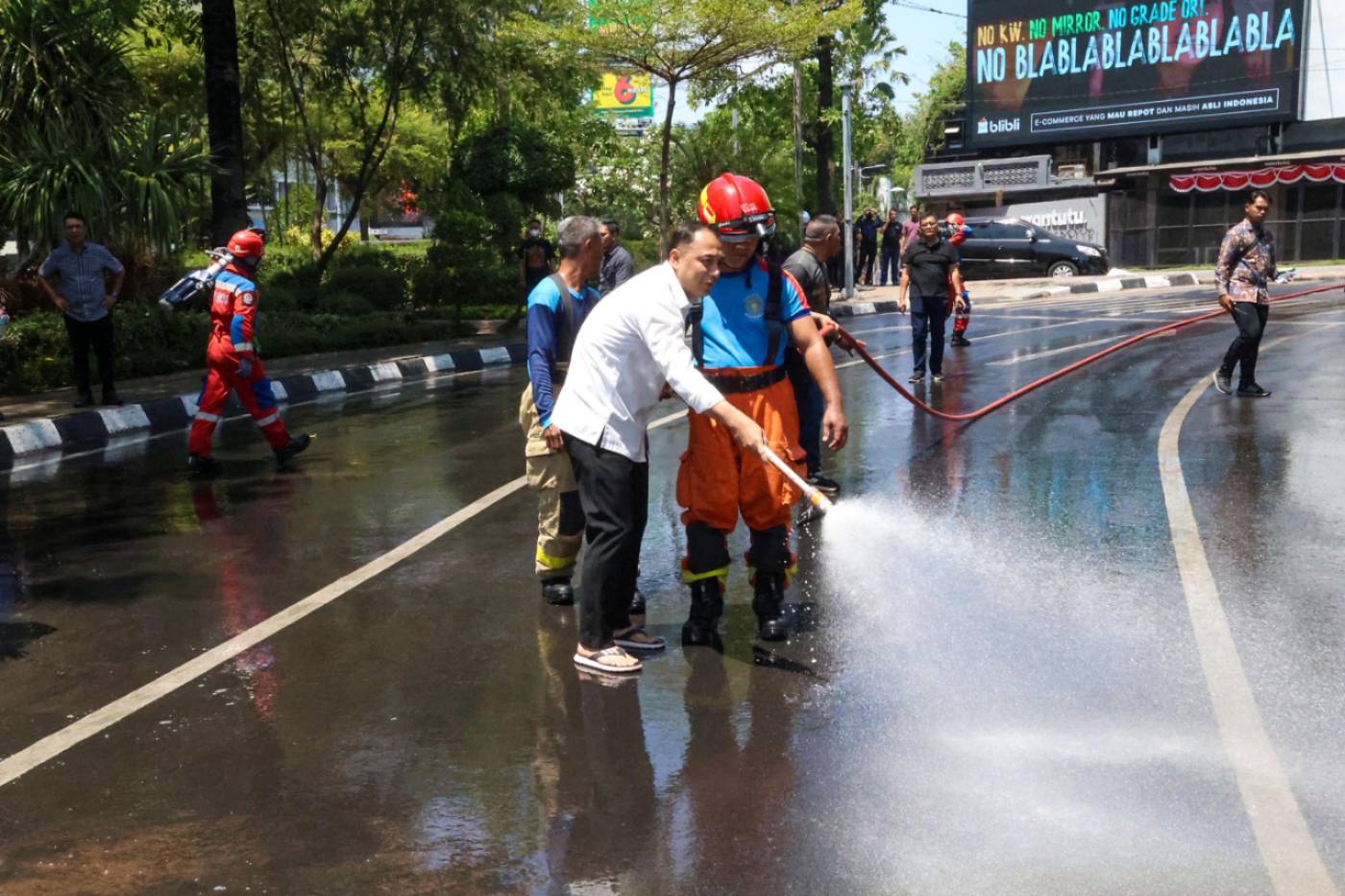 Untuk mengatasi hal ini, ia meminta penutupan sementara beberapa ruas jalan agar proses penyiraman dan pembersihan bisa berjalan optimal. Proses pembersihan ini sebetulnya telah dimulai sejak dini hari.