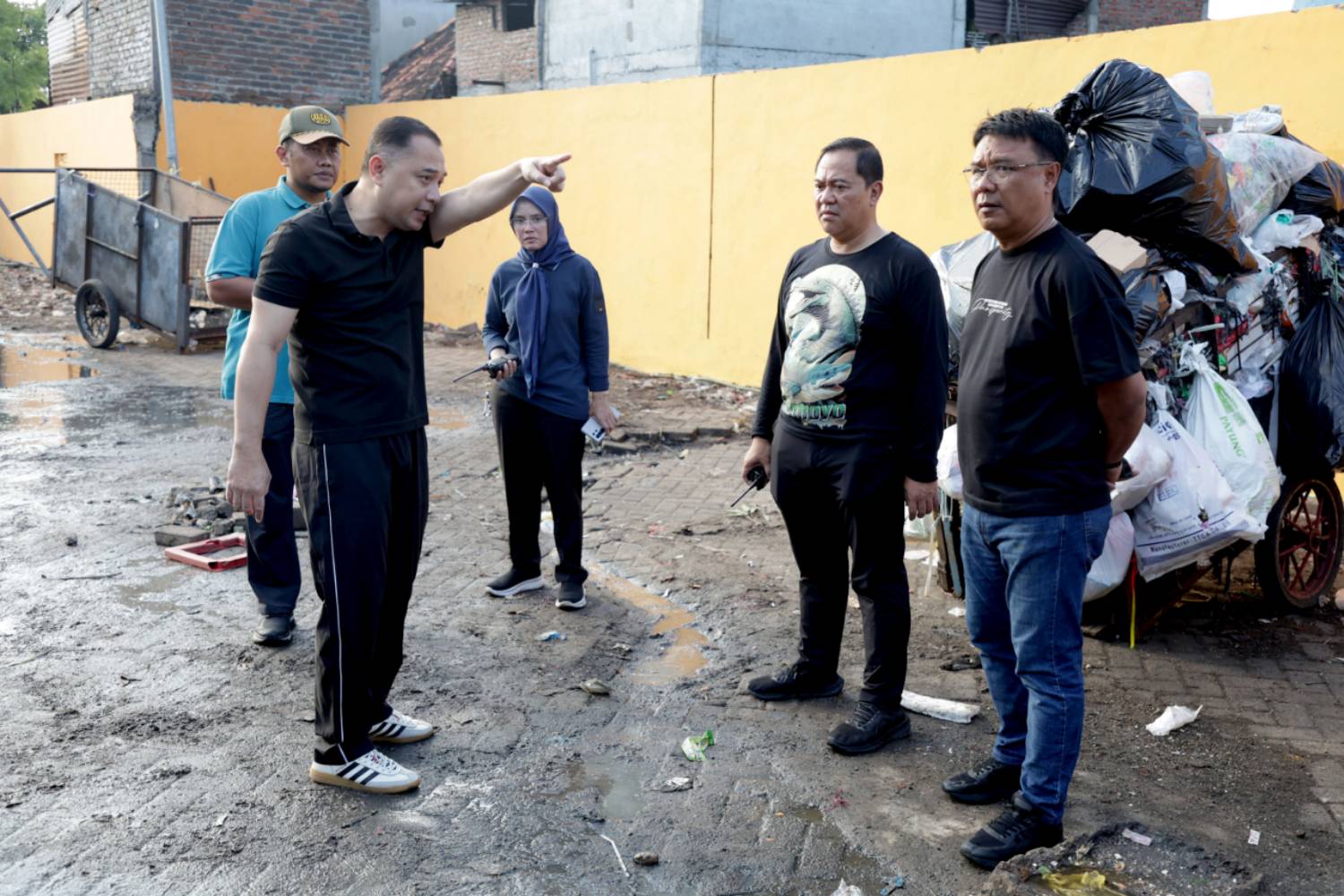 Saat berada di TPS Simpang Dukuh, Wali Kota Eri pun tak segan turun tangan langsung membantu petugas mengangkut sampah dan menginstruksikan penyemprotan cairan kimia agar area tersebut bersih dan tidak berbau.